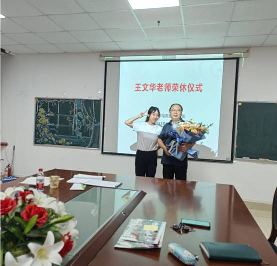仪式第四项,发表退休感言。王文华老师回首多年来在学院的工作经历,表示真切地感受到了学院这个大家庭的温暖和关怀,并表态将“离岗不离心,退休不退色”,继续为教育事业发挥余热。