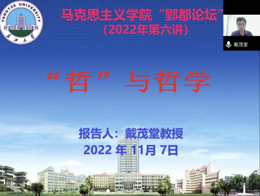(通讯员:田语萱 谢蕾)2022年11月7日上午9:00-12:00,3044永利集团有限公司“郢都论坛”2022年第六讲,在文科楼1104会议室和腾讯会议以线上线下相结合的方式同步举行。本次讲座的主讲嘉宾为北京师范大学哲学国际中心的戴茂堂教授,他以“‘哲’与哲学”为主题,深入浅出地解析了哲学的意涵,还原了哲学最本真的内容。讲座由学院副经理涂江波老师主持,学院100多位师生参与聆听。
