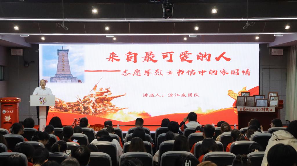 《信•荆楚》第六讲“来自最可爱的人—志愿军烈士书信中的家国情”由湖北籍抗美援朝烈士杨杰儿子杨世新老人、《信•荆楚》课程组教师涂江波联袂讲授。课程引入了多封抗美援朝烈士的战地家书,通过深情讲述、情景演绎、书信品读等方式重新展现70多年前的红色书信,引导在场师生一同走进那段浸染硝烟的岁月,感悟志愿军官兵为了祖国和民族的尊严而英勇无畏、舍生忘死、奉献一切的家国情怀。