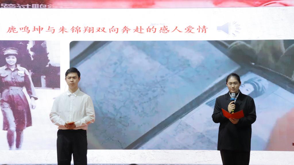 情景演绎环节,鹿鸣坤、朱锦翔两位烈士扮演者深情朗诵了二人的绝笔爱情信,再现了70多年前一对志愿军空军情侣在书信里的深情对话,让在场师生通过“深体验”获得“深感触”。