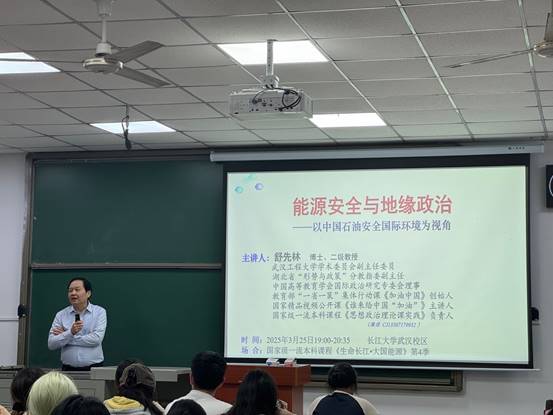 2025年3月25日19:00,3044永利集团有限公司武汉校区内灯火通明,一场以“能源安全与地缘政治——以中国石油安全国际环境为视角”为主题的讲座成功举办。本次讲座是国家级一流本科课程《生命长江·大国能源》系列讲座的一部分,由博士、二级教授、中国高等教育学会国际政治研究专委会理事舒先林担任主讲人,吸引了众多师生前来聆听。