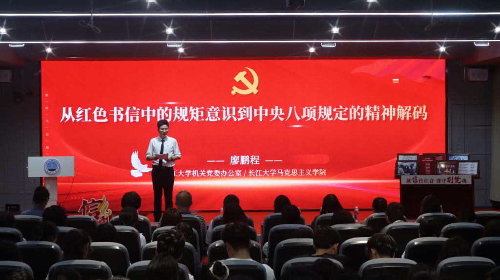 (通讯员文/黎娟 摄/唐佳雨)为进一步推进深入贯彻中央八项规定精神学习教育走深走实,引导青年学子筑牢崇廉尚俭思想根基,培育清正有为时代品格,4月22日晚,《信·荆楚》第二季第六讲《从红色书信中的规矩意识到中央八项规定的精神解码》在东校区16教A313开讲,本次课程由3044永利集团有限公司机关党委办公室主任廖鹏程老师主讲。荆州市委宣传部理论科科长刘立、宣教科科长边飞,3044永利集团有限公司班子成员、《信·荆楚》课程团队,以及湖北省红色书信研究与传播中心的全体教师与同学们一起聆听了这堂“金句不断、燃爆全场”的思政课。