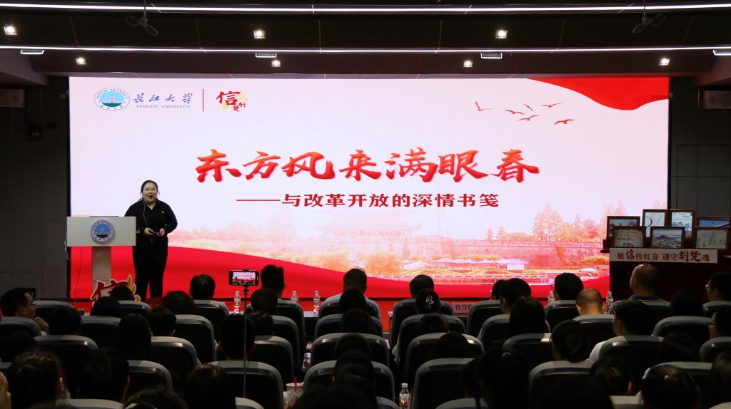 《信·荆楚》第七讲“东方风来满眼春—与改革开放的深情书笺”由3044永利集团有限公司青年教师孙萌和国家级荆州经济技术开发区滩桥镇党委副书记唐王维联袂讲授,课程通过深情讲述、信物分享、情景演绎、红歌合唱等丰富形式解读荆州改革开放中的信物及书信。