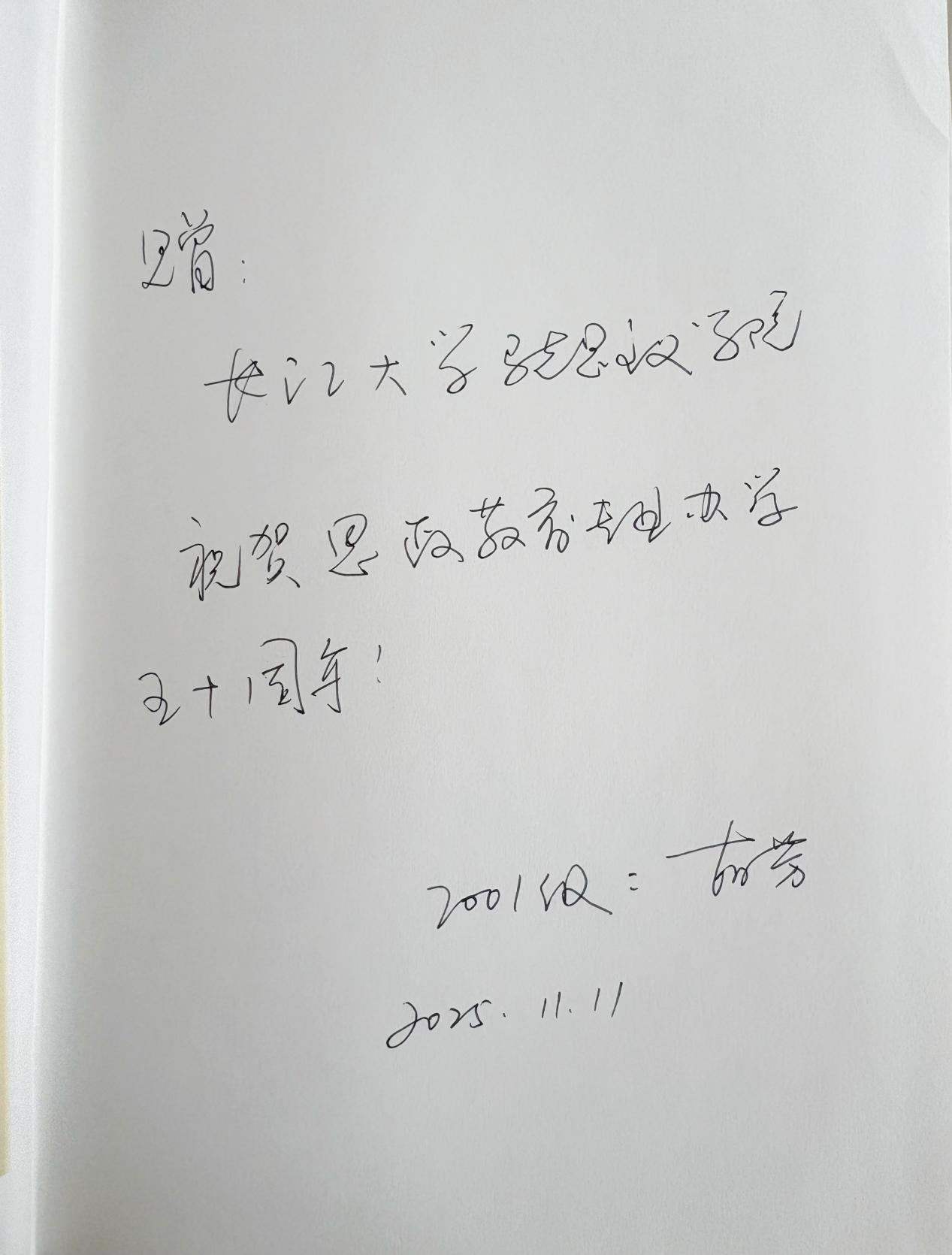 捐赠著作聚焦马克思主义理论、思政课教学实践、中国特色社会主义文化建设等核心领域,是胡芳教授多年学术研究与教学经验的结晶。扉页上“祝贺思政教育专业办学50周年”的题字,饱含对母校的深厚情谊与殷切期许。作为教育部“长江学者奖励计划”青年学者、国家社科基金重大项目首席专家,胡芳教授始终心系母校,此次捐赠为在校师生提供了接触前沿学术成果的优质资源,树立了反哺母校的榜样。