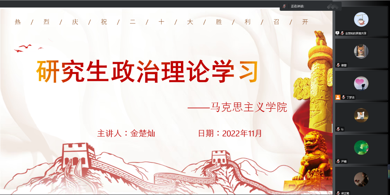 会议中,金楚灿同学带领大家深入学习党的二十大报告,并呼吁全体研究生要认真学习领会党的二十大精神,通过多种形式认真学、反复学,真正做到学深悟透、融会贯通。