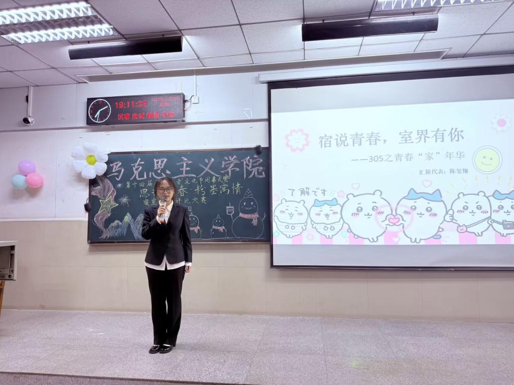 赛后,张云雾对各寝室表现进行总结点评。她表示:“本次寝室文化评比大赛不仅是一场风采展示,更是一次凝聚力的升华,各宿舍均展现出了有趣、有料、有爱的寝室文化风貌。”她期待同学们以包容之心、沟通之力构建和谐寝室人际关系,在寝室生活中践行互助友爱,让整洁成为习惯、文明成为自觉、团结成为常态,共筑安心学习、舒心生活、静心成长的“幸福家园”。